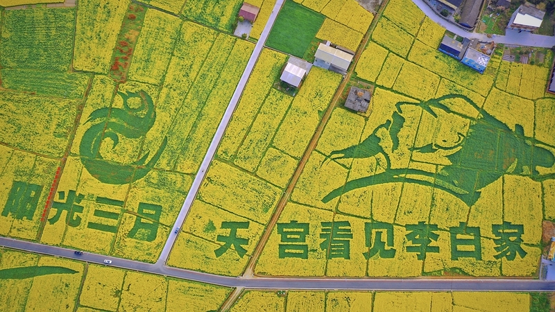 记者在江油市永胜镇永平村1组看到,李白头像的图案为绿色麦苗,种在以黄色油菜花为背景的田野之中,在墙体彩绘的衬托下,与四周农家小院相映成趣,构成了一幅美丽的乡村画卷。 头像线条粗细有致,圆润通灵,李白形象栩栩如生。除了头像,还有飘带、飞鸟等图案,下边是一行粗犷黑体字:“阳光三月,天宫看见李白家”。